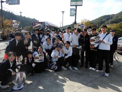 ラリーリエゾン観戦 公開日 2025/11/10 更新日 2025/11/10 学校の特色ある活動 11月7日(金)にラリージャパンのリエゾンを観戦しました。 3学年分かれて、今か今かとラリーカーが来るのを待ち構えました。 ラリーカーは外装はもちろん、遠くからも鳴り響くエンジン音もとても迫力がありました。選手が乗ったラリーカーが来るたびに、生徒は応援旗を振って大盛り上がりでした。 応援で支所に来られた市長さんともお会いでき、2年生は一緒に記念撮影もしていただきました。