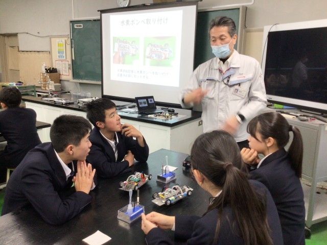 水素と酸素から電気を作り走る車の仕組みを学び、生徒は実際に燃料電池を作らせてもらいました。実際に工場で燃料電池自動車を作ってみえる講師の方々のお話はとても興味深く、繊細な燃料電池づくりにも真剣に取り組みました。最後に自分で作った燃料電池をミニカーにセットしてを走らせました。スムーズに走り出すミニカーにみんなで「おー」っと感心の声が上がりました。環境問題や最新の技術開発、将来への夢にと生徒は様々関心が高まったようでした。