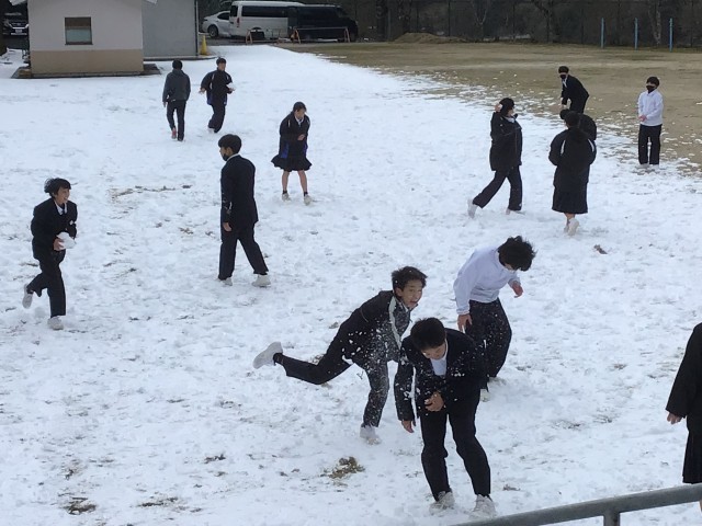 日が出てきて運動場に積もった雪はだいぶ解けてしまいましたが、日陰に残った雪で1年生は雪遊びをしていました。