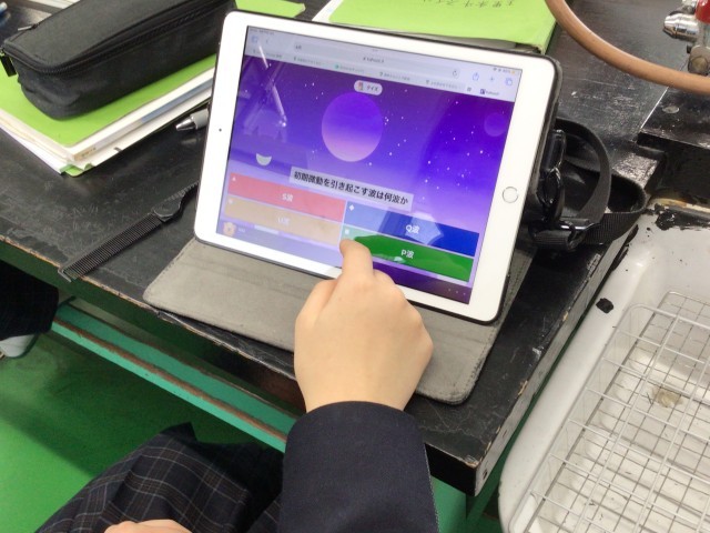 1年生は理科で火成岩について学んでいます。今日は、Kahoot!(カフート)というアプリで選択問題を解きながら、みんなでゲーム感覚で楽しく学んでいます。