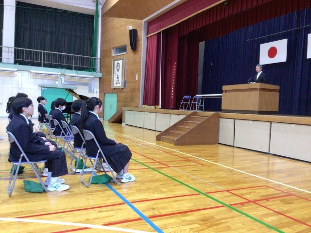 校長先生の式辞では生徒へ1年間のがんばりに対するねぎらいと、これからの足中生への願いについて話がありました。元気なあいさつができる足中生。今夏の大会後から本格的に始まるとよクラの活動に対しても自ら進んで取り組む姿勢をみせてほしい、来年度は地域のボランティアにより積極的に参加してほしい。努力したことにより得るものの価値に触れられ、それは校訓「自立」につながる道でもあると足中生への期待とエールを込めたお話をされました。