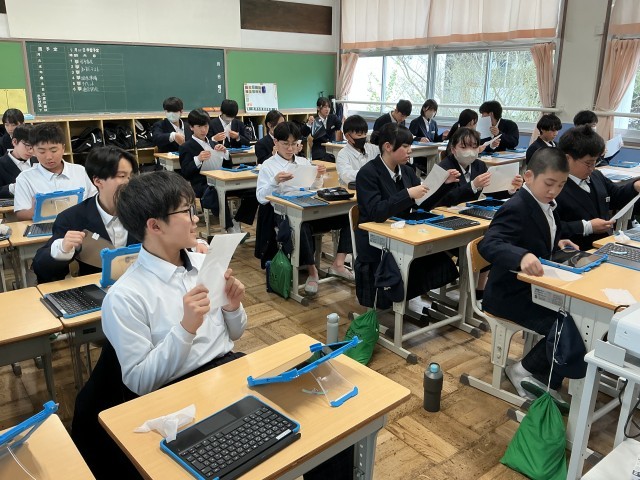 4月10日(金)には、2年生が新しいタブレットを初めて手にして、画面にカバーを貼る作業を行いました。