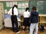 委員会活動中です。保健・給食委員会の人たちは、給食当番の白衣をチェックしていま...