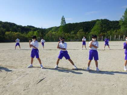 青組団(3-3,3-2,1-1)は運動場で、3年生リーダーの指揮のもと練習をしました。