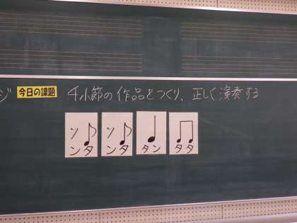 今日は、音楽の教室から小気味のよいリズム打ちの音が聞こえてきたので、のぞいてみると1年生が音符の長さに合わせて机を叩いていました。