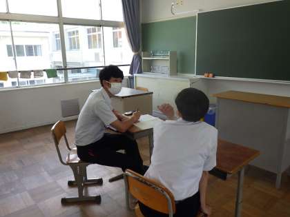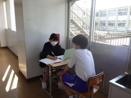キャリアカウンセリング(教育相談)始まりました(全校) 公開日 2022/05/24 更新日 2022/05/24 校長室から 体育祭が無事終わり、本日より前期中間テスト期間となります。 テスト期間に合わせて、担任が学級生徒を対象に個別でキャリアカウンセリング(教育相談)を実施します。 日ごろは、1対1で先生と話す機会がなかなかありませんので、この機会を通じて互いの信頼関係の醸成を主なねらいとしています。