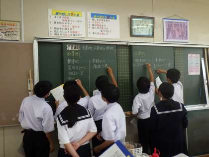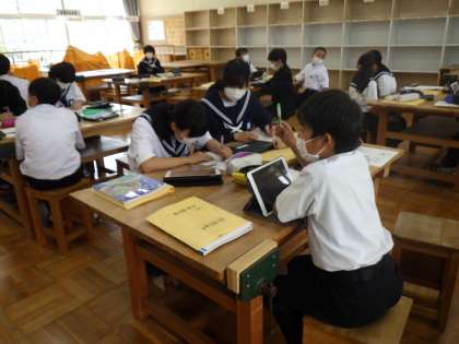 1年生の技術科では、木材の性質について、タブレットなどを活用してまとめています。