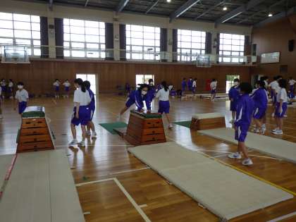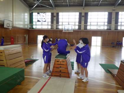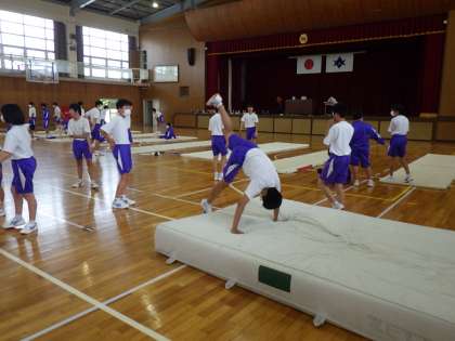 跳び箱の台上前転を友達同士で補助したり、マット運動の倒立前転など挑戦したりしています。