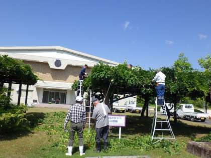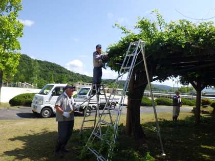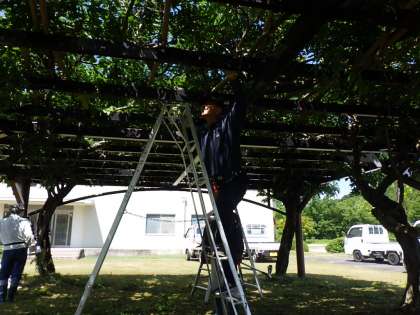 6月12日(日)、「木瀬里山づくり実行委員」みなさまに本校の藤棚の剪定をしていただきました。