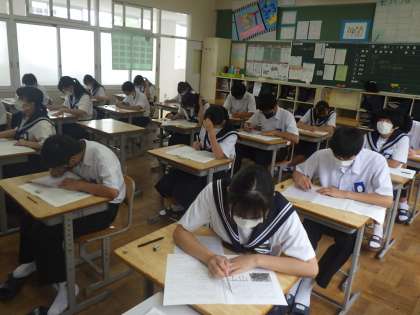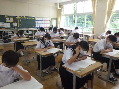 学習診断テストを受けました(3年生) 公開日 2022/07/14 更新日 2022/07/14 校長室から 3年生は、学習診断テストを受けました。 公立高校とほぼ同じ日程、教科順で実施しました。 3年生の生徒たちには、今回のテストの点数で一喜一憂することなく、今の自分に何が必要なのかを冷静に分析してほしいと思います。 そして、夏休みにどのような学習をするのか考える資料することが大切です。