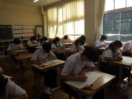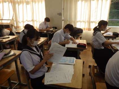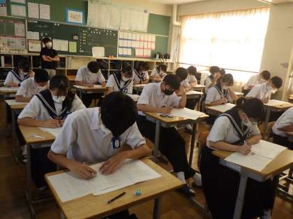 前期期末テスト始まりました 公開日 2022/09/12 更新日 2022/09/12 校長室から 前期の期末テストが3日間の日程で始まりました。 夏休み明け10日あまりでテストとなり、頭の切り替えをいかにうまくしたかが、問われる場面でもあります。 特に、3年生は進路選択が本格化する秋を迎えますので、切実です。 テスト前の休み時間にも、テスト対策に取り組む姿勢がたくさん見られました。