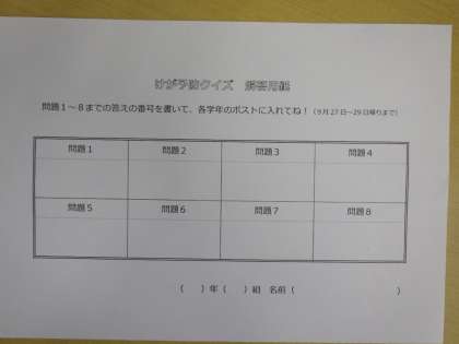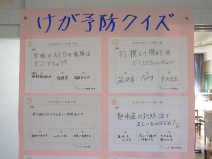 けが予防クイズをします(保健委員会) 公開日 2022/09/27 更新日 2022/09/27 校長室から 保健委員会の取り組みで「けが予防クイズ」が始まりました。 「学校にあるAEDの場所はどこでしょう?」など、8問のクイズが学年ろうかに掲示してあります。 それを解答用紙に答えて、学級ごとにポイントを競います。 楽しみながら、けがの予防について学べるよい企画ですね。