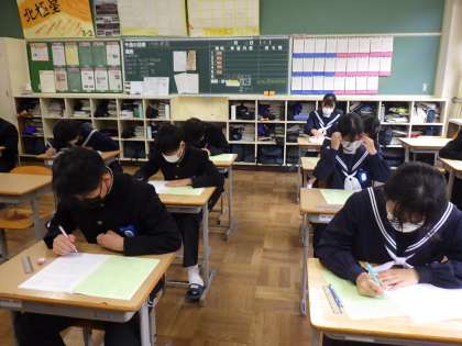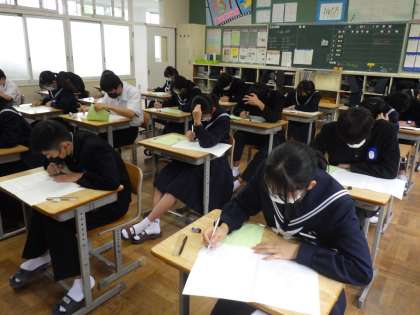 普段の授業では、私が教室に入っていくと、注目が集まることが多いですが、3年生の生徒はテストに集中して問題を解いていました。大切なテストと自覚をする姿に、受験生になったなあと感じました。