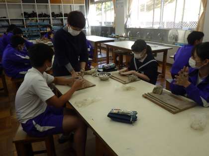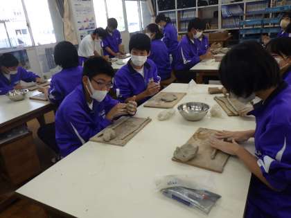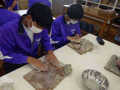 2年生の美術では、ひも型の陶土を重ねて作る、マグカップ作りに挑戦しています。