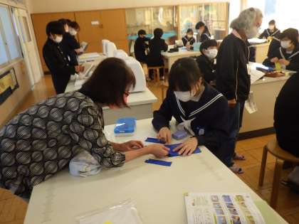 家庭科の授業支援をしていただきました(1年家庭科) 公開日 2022/10/21 更新日 2022/10/21 校長室から 1年生の家庭科では、裁縫の基礎を学習しています。 習った基礎の縫い方を駆使して、カードケースを作ります。 地域学校共働本部の紹介で、地域の方に縫い方のアドバイスをする授業支援をしていただきました。 講師の地域の方々には、全部で7回の支援をお願いしています。 よろしくお願いいたします。