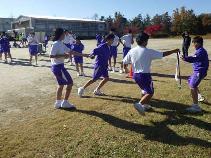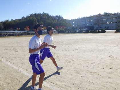 駅伝大会をしました(2年) 公開日 2022/11/15 更新日 2022/11/15 校長室から 本日は、2年生が体育の時間に駅伝大会をしました。 秋晴れの気持ちのいい気候とロケーションの中、力走をみせました。 まだ自分の順番が残る中、友だちのためにそばまで駆け寄り、声援を送る姿もよかったです。 これで、3学年とも駅伝大会が終わりました。体育の先生たちが、生徒たちの持久力をつけるために、工夫した取り組みに生徒たちも応えていました。