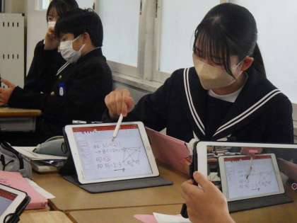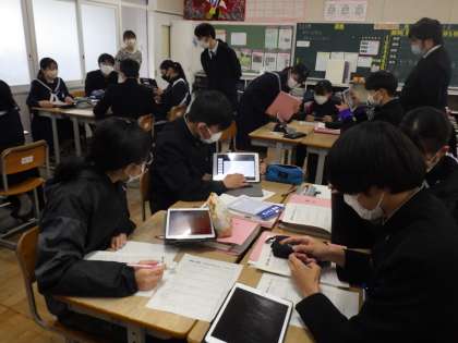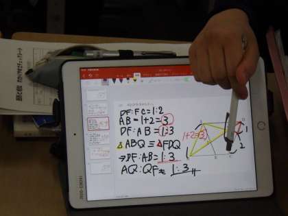 研究授業を行いました(3年数学) 公開日 2022/11/30 更新日 2022/11/30 校長室から 3年の数学で「図形と相似」の単元で研究授業が行われました。 指導案をたて、実際に授業を行い、その後に協議をして、教員の授業力向上を目指します。 今日は、学習用タブレットのパワーポイントを使い、友だちのアドバイスをもとに、より分かりやすい説明をすることをねらいとしました。 全員が一生懸命考えるよい授業となりました。