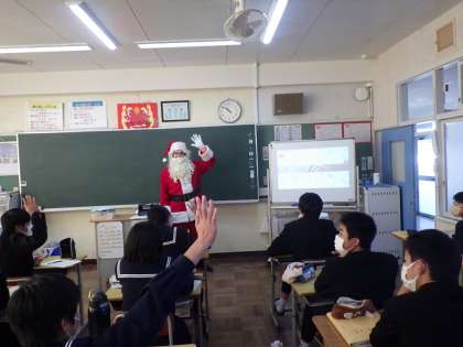 ALTサンタがやってきた(2年英語) 公開日 2022/12/12 更新日 2022/12/12 校長室から 本校のALT(assistant langueage teacher=外国語指導助手)が授業を楽しく盛り上げようとサンタの格好をしてくれました。 教員がやると少し浮く気がしますが、ALTがやると違和感なく受け入れられるので不思議です。生徒たちにも笑顔があふれます。 普段の日常に少しの変化があることは、大切なことだと感じました。 自前で衣装を用意してくれたALTには感謝です。
