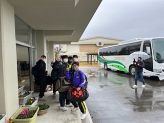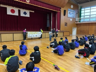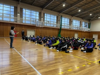 体育館で出発式を行い、2泊3日の自然教室に笑顔で出発しました。