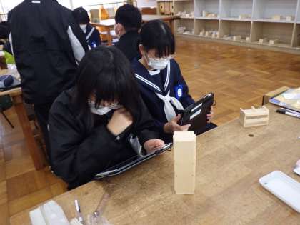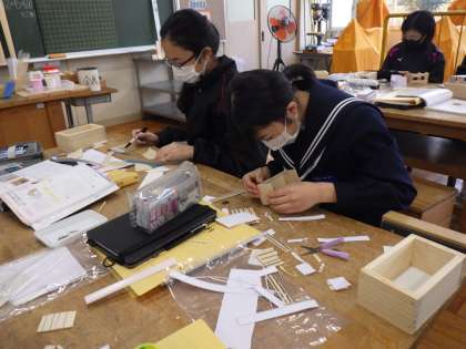1年の技術では、自分の欲しい形の棚やケースを作成するために模型を作っています。