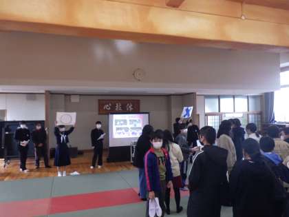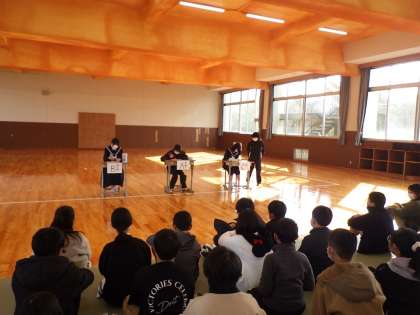 小中交流会をしました(1年生) 公開日 2023/01/24 更新日 2023/01/24 校長室から 入学説明会で保護者が説明を聞いている間、中1の子たちが新入予定の小6の子たちを招待して、小中交流会を企画しました。 中学校の1年間を〇×クイズや寸劇にして、新入生の子たちに楽しく伝えることができました。 新入生のみなさんは、残り少ない小学校生活をしっかりと過ごして、中学校に進学してほしいと思います。