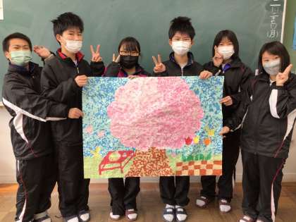 1月の終わり頃から取り組んでいた卒業制作が完成しました。これまで、毎月の行事や風物を入れた掲示物を作ってきた経験を活かし、4月の風景をちぎり絵で表現しました。構図や配色などをみんなで話し合い、協力して作り上げました。卒業する3年生との思い出の一つになりました。