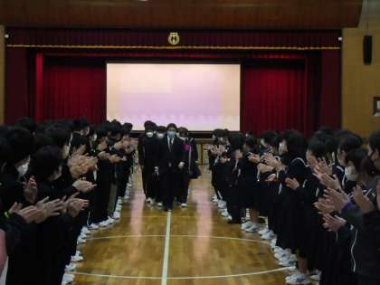 卒業生を祝う会その2 公開日 2023/03/01 更新日 2023/03/01 校長室から 体育館や3年生廊下に飾り付けられたプレゼントも見事でした。 思い出スライドで3年間を振り返りました。どの写真もマスク越しでしたが、3年間の中学校生活を楽しんだことがよく分かりました。 在校生のよる花道を通る3年生の顔はどの子も輝いて見えました。 心のこもったすばらしい会になりました。