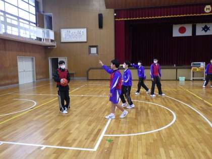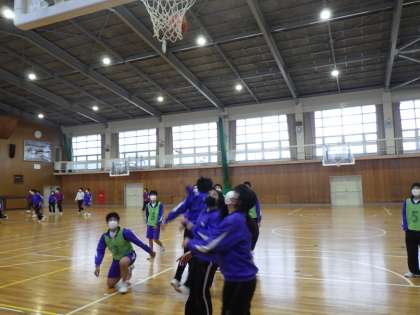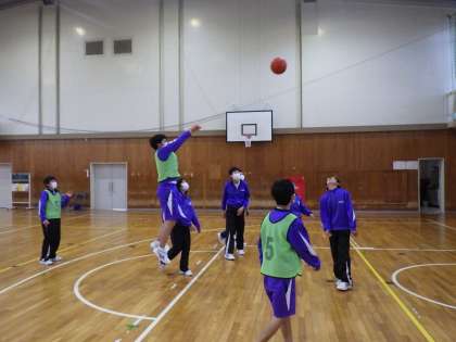 2年生の体育では、雨天時はバスケットボールを行っています。