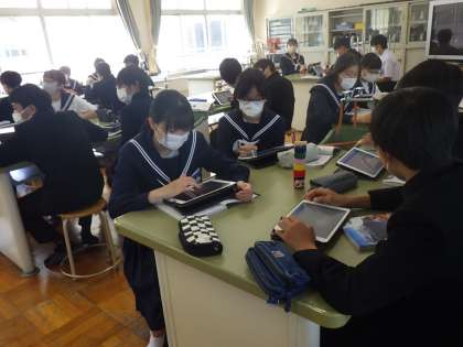 学習用タブレットで考えをまとめ、友だちの意見と共有しながら、理解を深めていました。