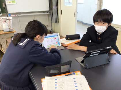 タブレットを用いた化学反応式作り(2年理科) 公開日 2023/05/17 更新日 2023/05/17 各学年から 2年生の理科では、学習用タブレットを活用して化学反応式の理解を深めています。 化学反応式を作る際、係数を間違えてしまう生徒が多いですが、タブレットの分子モデルを活用することで、パズルのように楽しく正確に作ることができていました。また、この作り方は、プログラミング的思考を取り入れています。