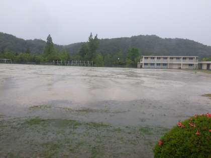 予定されていた準備が出来ないうえに、写真の通りのグランドコンディションで明日は体育祭の実施が難しいと判断し、日曜日に延期することにしました。