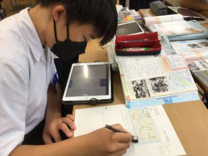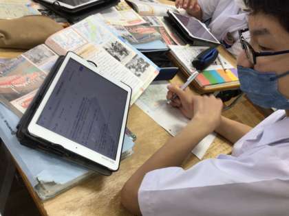 学習用タブレットを使い、班で協力しながら進めることができました。