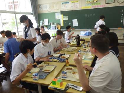 オレゴン留学生との交流(1・2年) 公開日 2023/07/10 更新日 2023/07/10 校長室から 現在、加茂丘高校にオレゴン州から交換留学生(高校生)が来日しています。現在、地域の各家庭にホームステイ中です。 豊田市と合併前の藤岡町時代からオレゴン州ベント市と長年にわたり、交流があります。4年ぶりの来日となります。 今日は、藤岡中学校に来校し、1・2年生の英語の授業で交流しました。 また、給食も2年生と一緒に食べました。