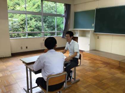 キャリアカウンセリング(教育相談)を実施しています(全校) 公開日 2023/09/04 更新日 2023/09/04 校長室から 今週は、前期期末テスト週間です。 その期間に合わせて、現在キャリアカウンセリングを実施しています。 夏休みの振り返りやテストに向けての学習状況の確認をします。 3年生は、進路についての話が中心となることと思います。 テスト週間を機会に早く学校生活のリズムを取り戻してほしいと思います。