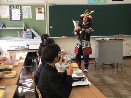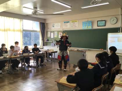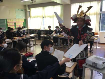 武士登場(1年社会) 公開日 2023/11/14 更新日 2023/11/14 校長室から 1年生の社会科の歴史では、武士のおこりについて学習しています。 今日は、社会科担当の先生が、郷土資料館から借りてきた鎧や兜のレプリカを着て登場です。 生徒たちは、先生の突然のコスプレに大喜びでした。「夢に出てきそう!」とつぶやく女子もいました。 授業に興味を引き付ける先生たちの工夫がすばらしいですね。