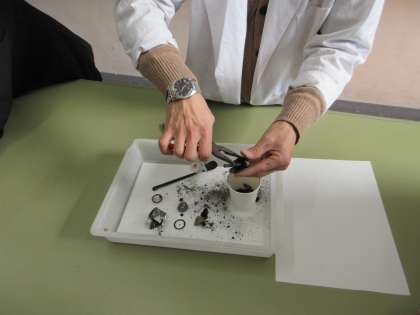 マンガン電池を分解してみました(12学級) 公開日 2023/11/20 更新日 2023/11/20 校長室から 12学級の理科では、「マンガン電池を分解してみよう」という学習をしていました。 使用済みの電池をペンチとニッパーを使って、外側の金属を外してみると、二酸化マンガンの粉と炭素棒が出てきました。 私も電池の中を見てみたのは、初めてでしたので大変興味深かったです。