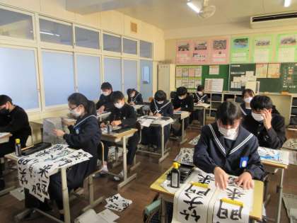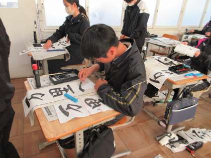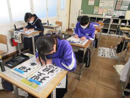 それぞれの生徒が、書初め用紙に向き合い一生懸命取り組みました。