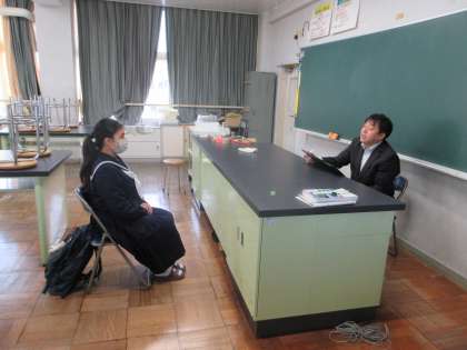 ただ今、面接練習中(3年) 公開日 2024/01/30 更新日 2024/01/30 校長室から 2月6日には、公立の推薦入試や特色選抜入試があります。 入試に面接がある学校の生徒に、先生方が手分けして、面接の練習をしています。 どの生徒も、よく練習をして面接練習に臨んでいますが、やはり緊張は隠せません。 当日は、もっと緊張するはずなので、しっかりと練習をしておくことが大切ですね。