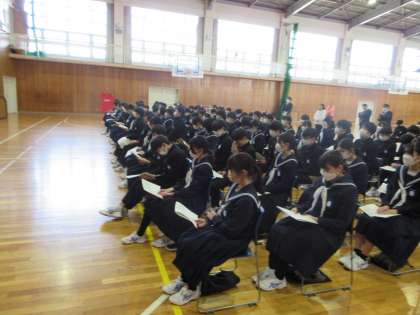 体育館で立候補者による立会演説会を行い、各立候補者は全員原稿なしで立派な決意表明を行いました。