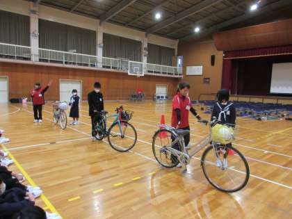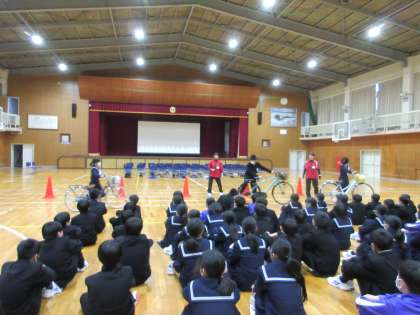 自転車安全運転講習会(1年) 公開日 2024/04/16 更新日 2024/04/16 校長室から 1年生は、豊田市交通安全センターの方を招いて、自転車安全運転講習会を実施しました。 4月は、他の月と比べて、自転車の事故が多いですので、この時期に講習会を行うことはとても大切です。 実際に自転車を操作しながら、点検活動や危険な乗り方について学びました。 学んだことを生かして、安全に登下校してほしいと思います。