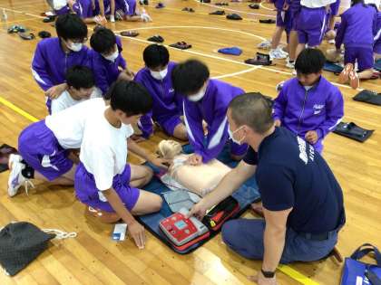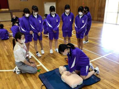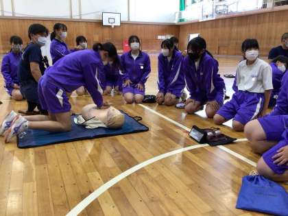 応急手当講習会(2年) 公開日 2024/06/05 更新日 2024/06/05 各学年から 豊田北消防署藤岡小原分署の方を講師にお迎えして、応急手当講習を行いました。 動画を視聴して、胸骨圧迫のやり方とAEDの使い方の説明を受けました。 また、人形を使って、実践の練習をしました。胸骨圧迫では、胸の中心を一定のリズムで圧迫することを意識しながら取り組みました。