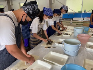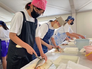 体験活動は、各組に別れて、魚さばき体験をして、海鮮料理をいただきます。