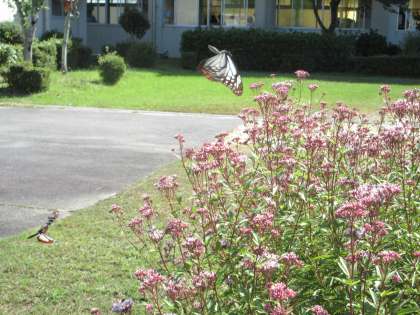 アサギマダラの好む希少植物「フジバカマ」を植えたところ、2年前より本校にも来るようになりました。