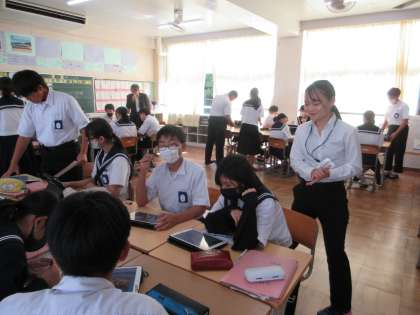 実習生が研究授業をしました(2年英語) 公開日 2024/10/17 更新日 2024/10/17 校長室から 英語科の教育実習生が、2年1組で研究授業を行いました。 「留学生に自分の国のルールと良さを伝えよう」という設定で、各国の紹介プレゼンテーションを作り、英語で伝えるというものです。 緊張しながらも、これまでの3週間の実習を生かした授業を展開することができました。
