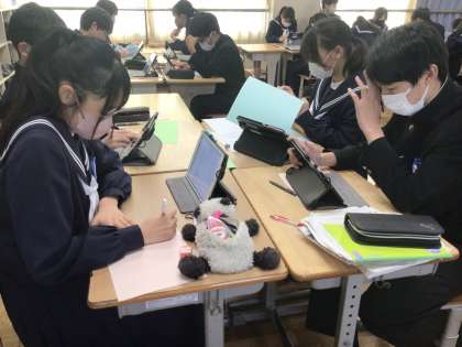 パンフレットやタブレットを利用して、班ごとに豊田市の高校についてまとめています。