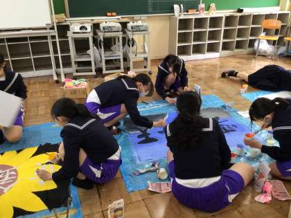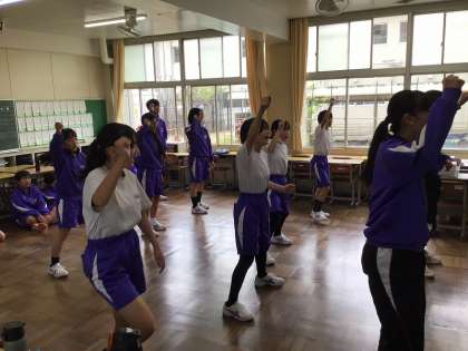 1年生が、組団に分かれて「創作ソーラン」の練習をしています。3年生の団長・副団長がとても丁寧に教えてくれています。また、並行して、団旗作りも行っています。