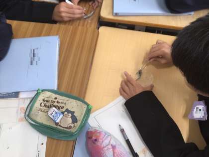 動物の体のつくりを調べるために、ピンセットを使いながら、煮干しの観察をしました。実際に実物を見ることで、興味・関心が高まり、理解も深まります。また、調べたことを記録として残したり、仲間と分かったことを共有したりすることで、さらに深い学びとなります。