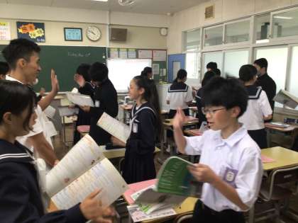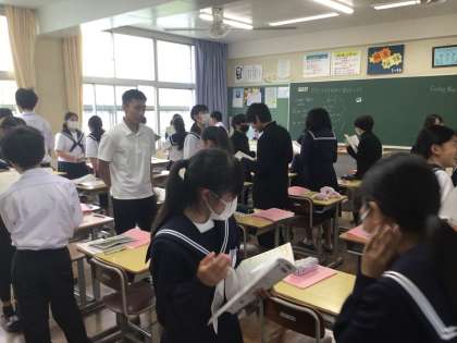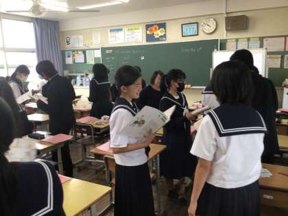 英語で仲間と会話をしていました。みんな笑顔で会話することができていました。また、大学生ボランティアも生徒に交じって一緒に活動してくれました。これからも生徒が興味をもって参加できる授業を目指していきます。