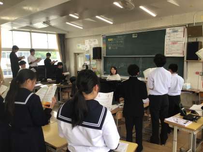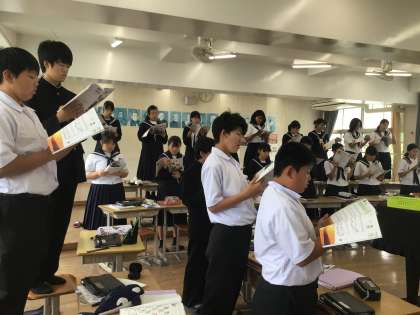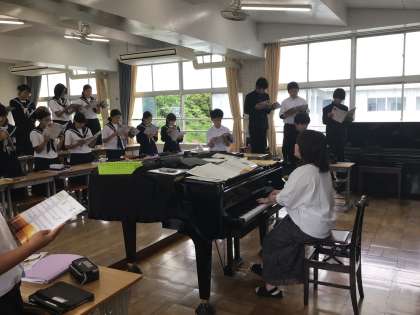 音楽の授業で、合唱の練習をしていました。先生の伴奏及び歌声に合わせての練習です。歌は、「浜辺の歌」です。みんな素敵な歌声を響かせていました。