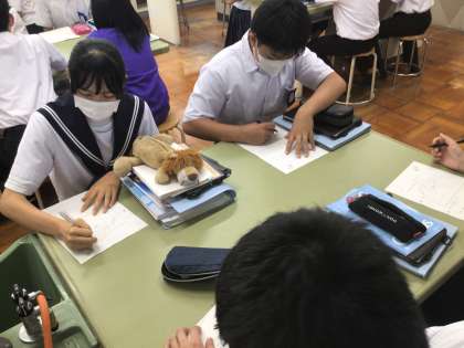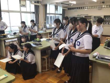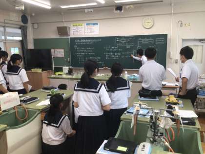 「水溶液と金属板を組み合わせて電池をつくろう!」の課題の元、先生の説明を聞き、その後、班でまとめを行っていました。
